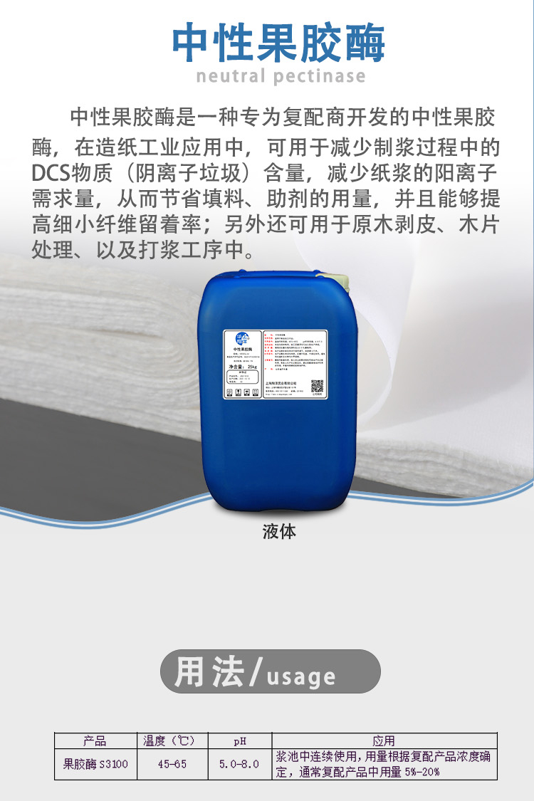 中性果胶酶 在造纸工业中可用于原木剥皮、木片处理、以及打浆工序中。