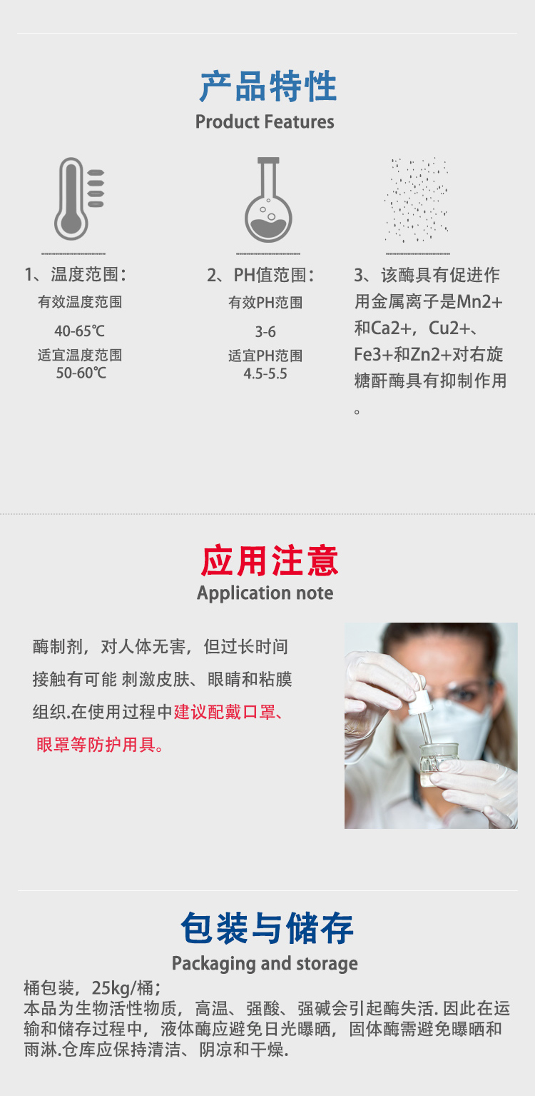 This product is Dexteanase (EC 3.2.1.11) , also known as α-glucanase. It is produced by the purification and extraction of the strain through submerged fermentation. The enzyme is mainly responsible for the degradation of α-1 in Dextran (α-glucan) , 6-glucoside bond, so that the chain of dextran shortened, molecular weight reduction.