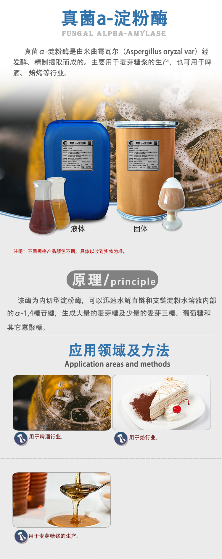 Fungal alpha-amylase is produced by fermentation and refining of Aspergillus oryzal var. Mainly used in the production of malt syrup, but also used in beer, baking and other industries.