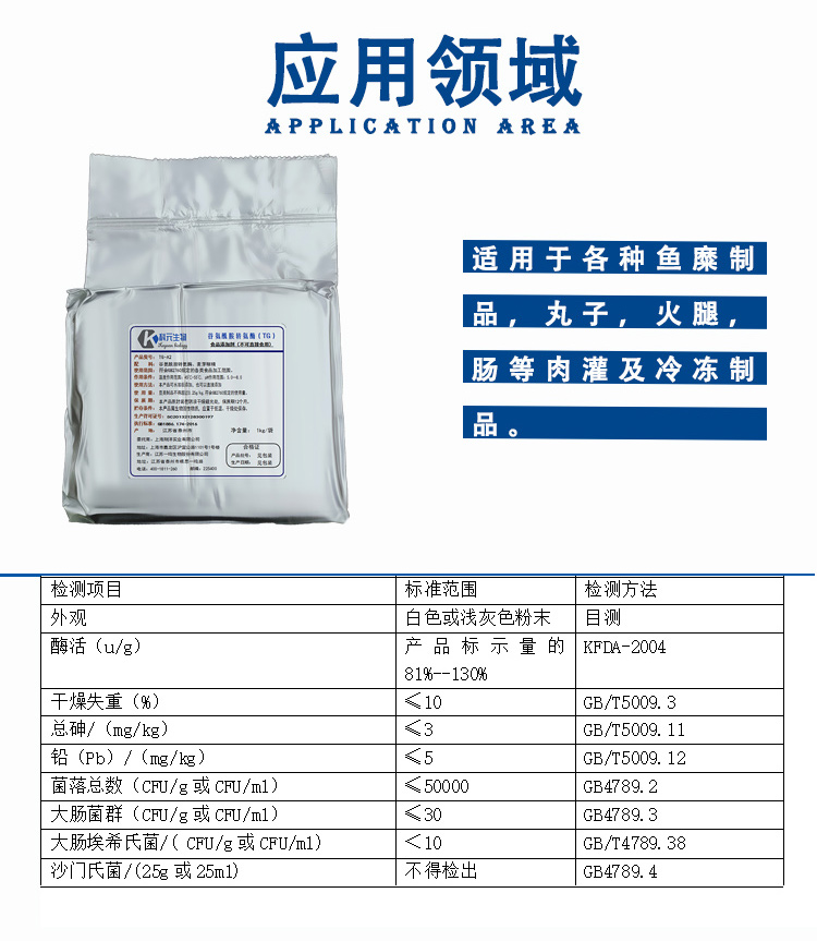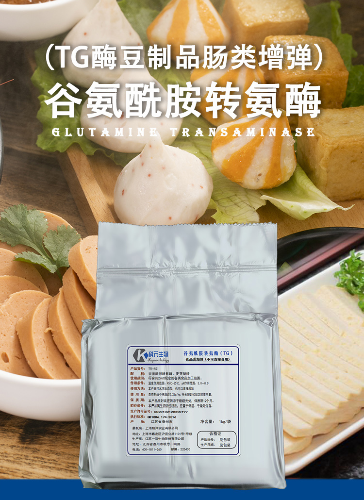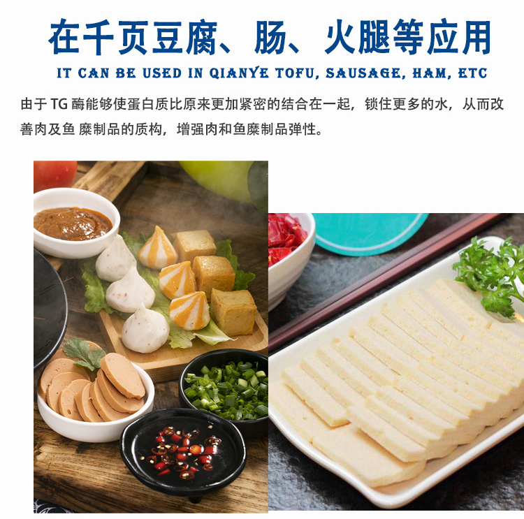 【产品应用】TG可催化蛋白质多肽发生分子内和分子间的共价交联,从而改善蛋白质的结构和功能;可用于肉制品、鱼制品、面制品及豆制品等产品中。