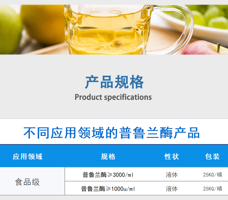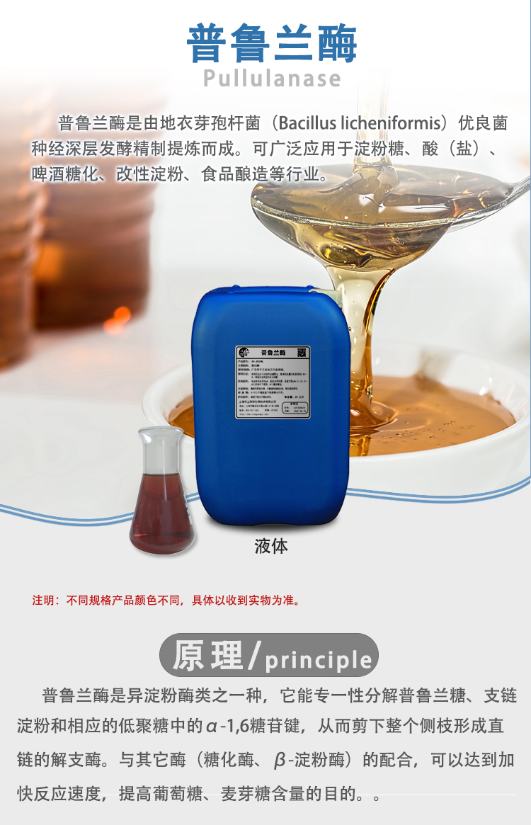 普鲁兰酶是由地衣芽孢杆菌(Bacillus licheniformis)优良菌种经深层发酵精制提炼而成。可广泛应用于淀粉糖、酸(盐)、啤酒糖化、改性淀粉、食品酿造等行业。