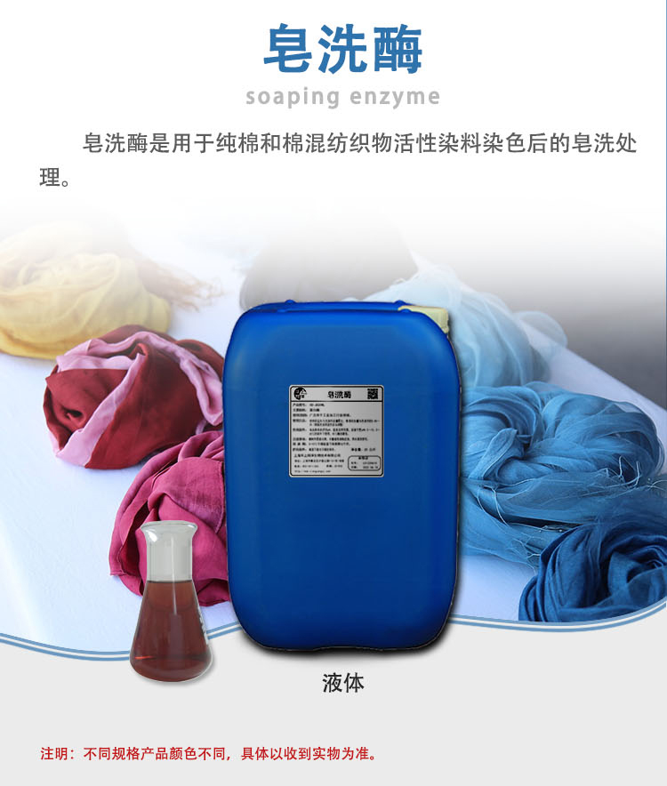 SOAPING enzymes are used in textile dyeing and finishing instead of chemical soaping agents. Used for soaping treatment of cotton and cotton blended fabric dyed with reactive dyes.