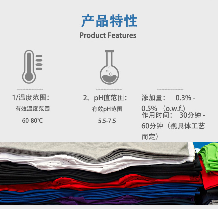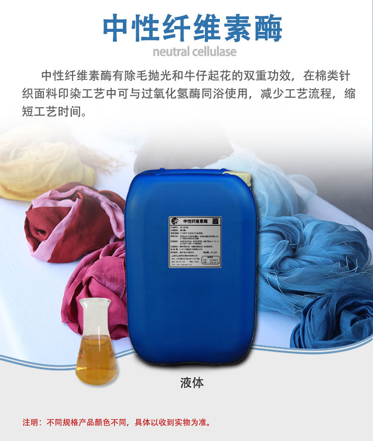 纤维素酶是由木霉(Trichoderma) 诱变筛选的高产菌株, 经液态深层通 风发酵精制提取制成。该产品主要应 用于纺织行业,