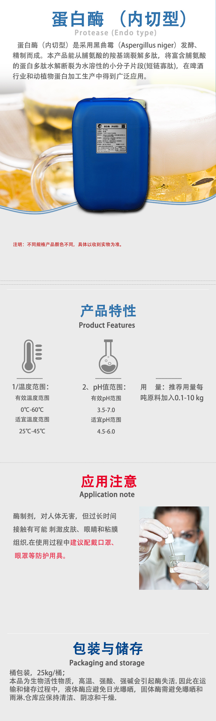蛋白酶(内切型 啤酒生产用)是采用优良菌株黑曲霉(Aspergillus niger)经液体深层发酵、精制而成的生物酶制剂。该酶只从脯氨酸的羧基端裂解多肽,从而阻止了多肽和多酚的氢键结合,可以有效地防止啤酒冷浑浊的形成,并且不影响啤酒的泡持性和口味。