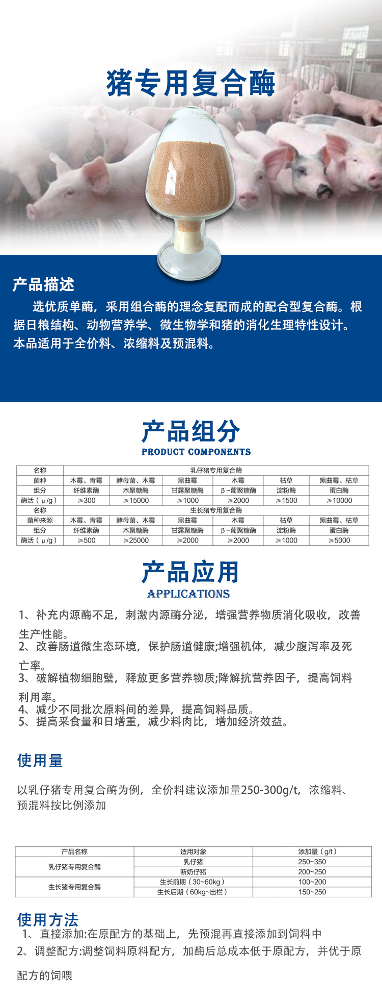 猪专用复合酶是由公司遴选优质单酶,采用组合酶的理念复断而成的配合型复合酶根据日粮结构、动物营养学、微牛物学和猪
