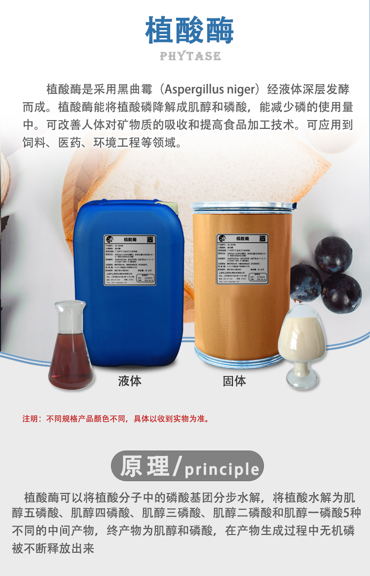 植酸酶是采用黑曲霉(Aspergillus niger)经液体深层发酵、超滤等工序精制而成。植酸酶能将植酸磷降解成肌醇和磷酸,作为环境友好型的酶制剂在减少磷的使用量中具有重要意义。