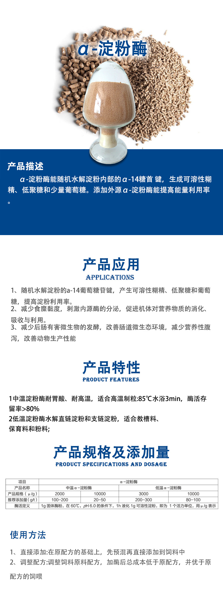 1、随机水解淀粉的a-1.4 葡萄糖苷键,产生可溶性糊精、低聚糖和葡萄糖,提高淀粉利用率。
