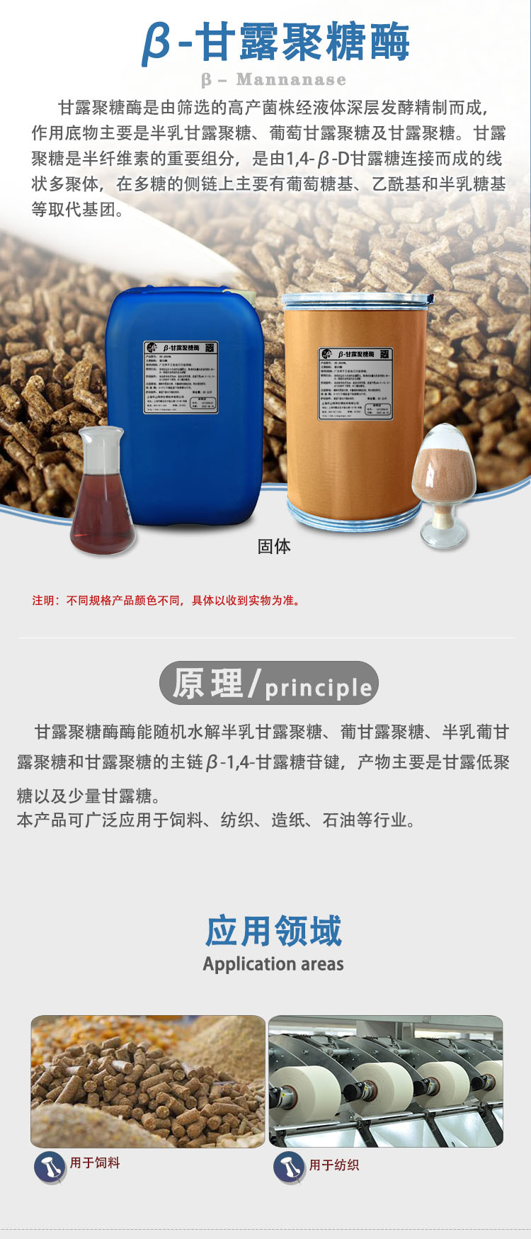 nige),中性甘露聚糖酶生产菌株为里氏木霉 Trichodermareesei);两者均采用先进的液体深层发酵技术精制而成,能作用于1.4-B-D吡喃甘露聚糖主链,降解饲料原料中半乳甘露聚糖、蕾萄甘露聚糖、半乳葡萄甘露聚糖等物质生成甘露寡糖。