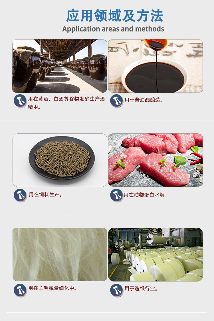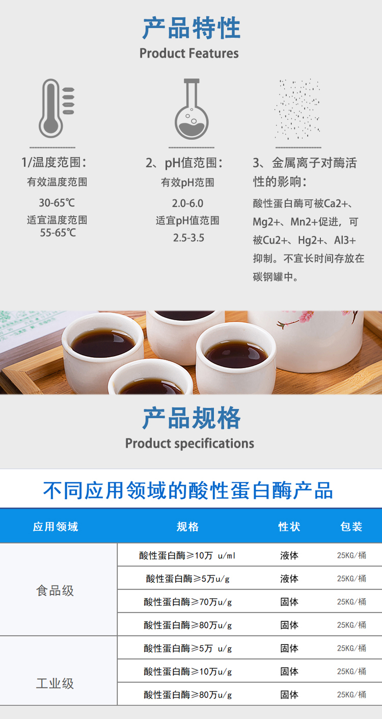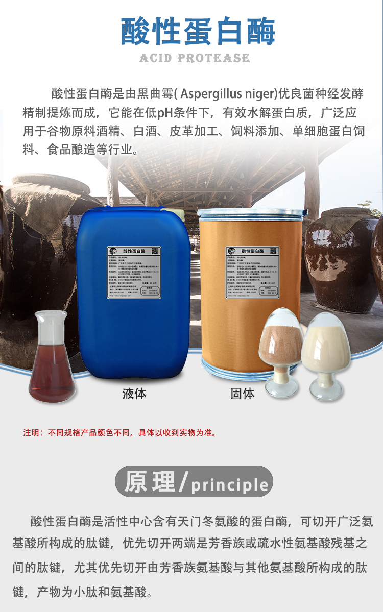酸性蛋白酶是由黑曲霉( Aspergillus niger)优良菌种经发酵精制提炼而成,它能在低pH条件下,有效水解蛋白质,广泛应用于谷物原料酒精、白酒、皮革加工、饲料添加、单细胞蛋白饲料、食品酿造等行业。