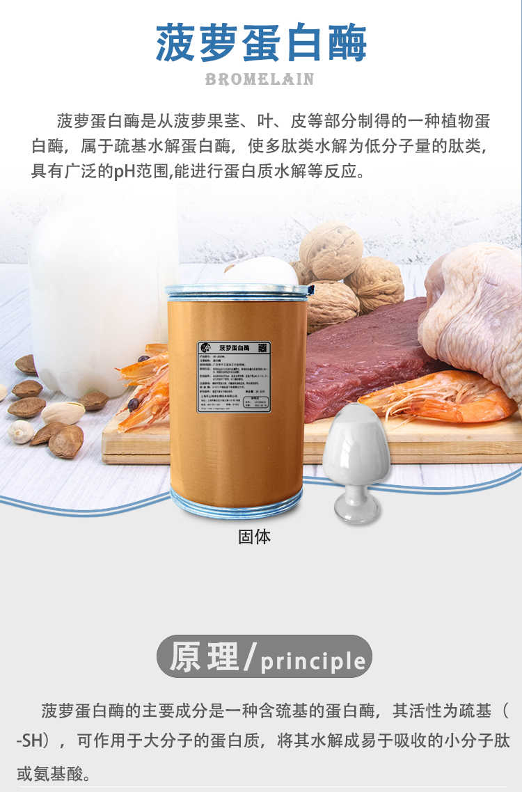 菠萝蛋白酶又称菠萝酶。由菠萝汁、皮等提取的巯基蛋白酶。浅黄色无定形粉末,微有特异臭。分子量33000。对酪蛋白、血红蛋白、BAEE的适宜pH值是6~8,对明胶是pH值5.0。酶活性受重金属抑制。略溶于水,不溶于乙醇、丙酮、氯仿和乙醚。它优先水解碱性氨基酸(例如精氨酸)或芳香族氨基酸(例如苯丙氨酸、酪氨酸)的羧基侧上的肽链,选择性水解纤维蛋白,可分解肌纤维,而对纤维蛋白原作用微弱。可用于啤酒澄清、药用消肿。