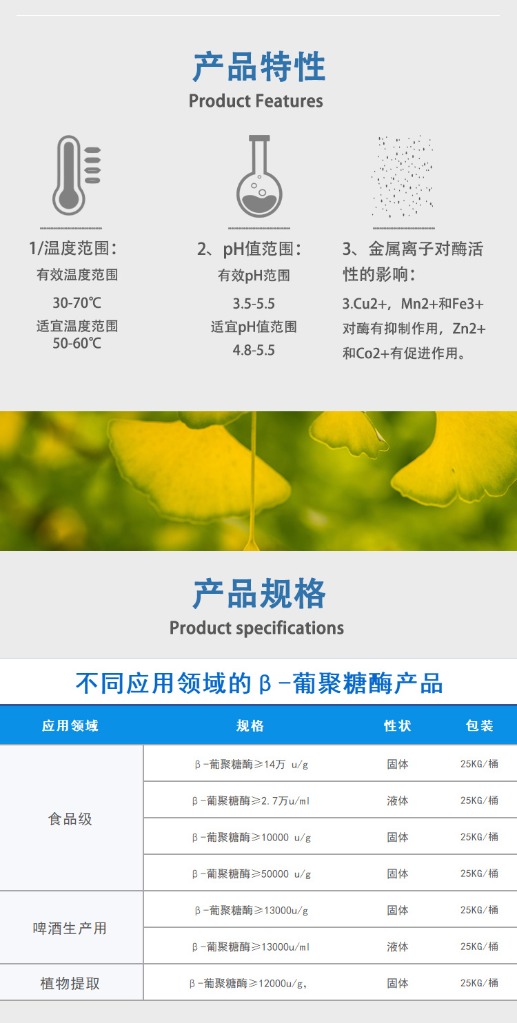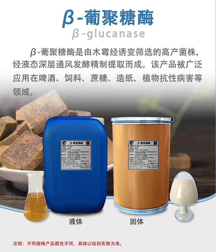 β-葡聚糖酶是由木霉经诱变筛选的高产菌株,经液态深层通风发酵精制提取而成。该产品被广泛应用在啤酒、饲料、蔗糖、造纸、植物抗性病害等领域。