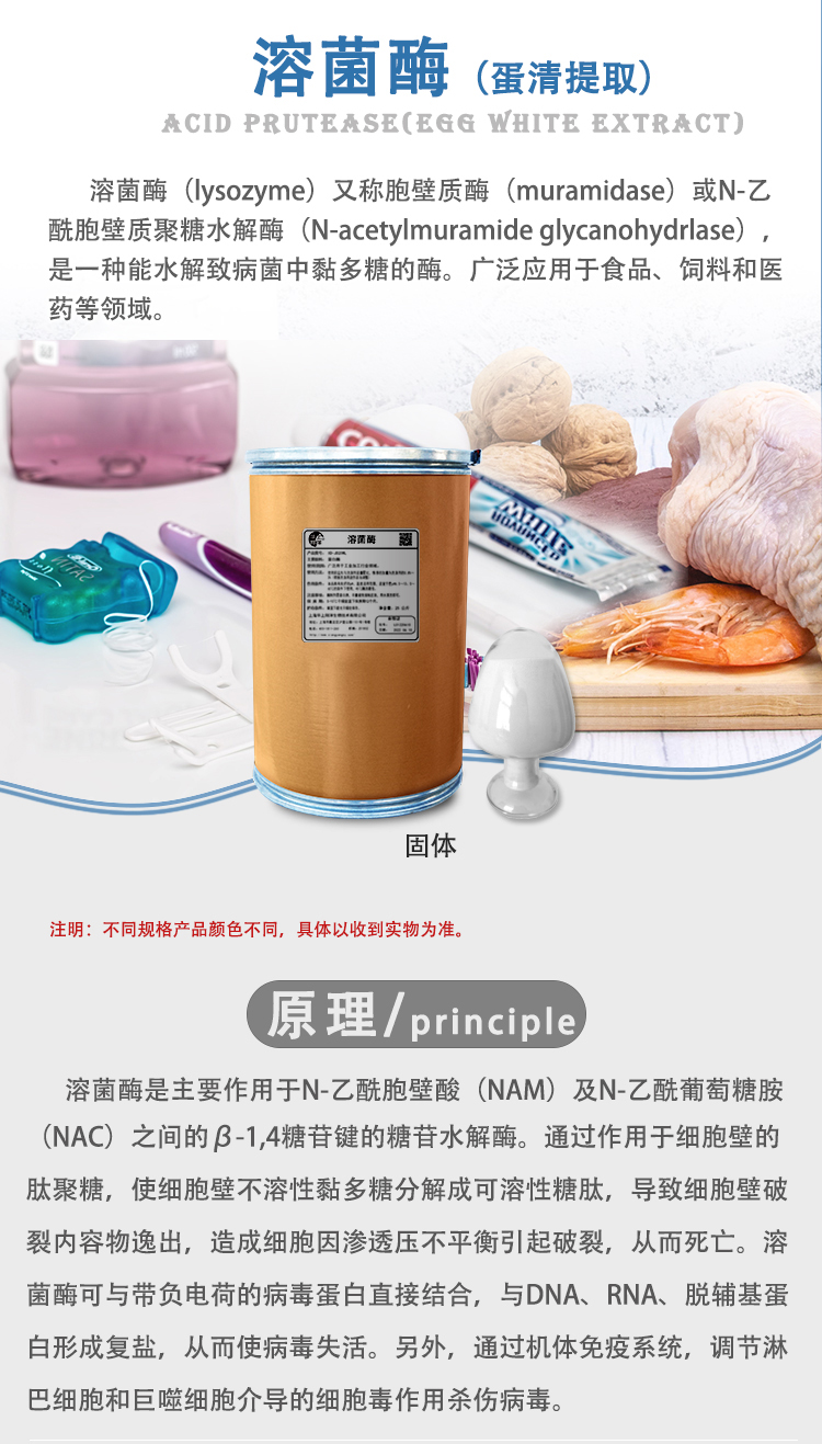 Lysozyme, also known as muramicase or N-acetylmuramicide glycolase, is an enzyme that can hydrolyze mucopolysaccharides in pathogenic bacteria. In nature, lysozyme is commonly found in the egg whites of birds and poultry, as well as in the tears, saliva, blood, nasal mucus, urine, milk, and tissue cells of mammals (such as liver, kidney, lymphoid tissue, intestine, etc.). Lysozymes can also be isolated from plants (such as papaya, turnip, barley, figs, cabbage, radish, etc.).