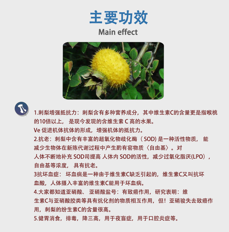 1.刺梨增强抵抗力:刺梨含有多种营养成分,其中维生素C的含量更是指喉桃的10倍以上, 是现今发现的含维生京 C 高的水果。 Ve 促进机体抗体的形成,增强机体对抵抗力。