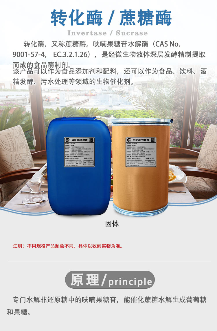 转化酶,又称蔗糖酶,呋喃果糖苷水解酶(CAS No. 9001-57-4, EC.3.2.1.26),是经微生物液体深层
