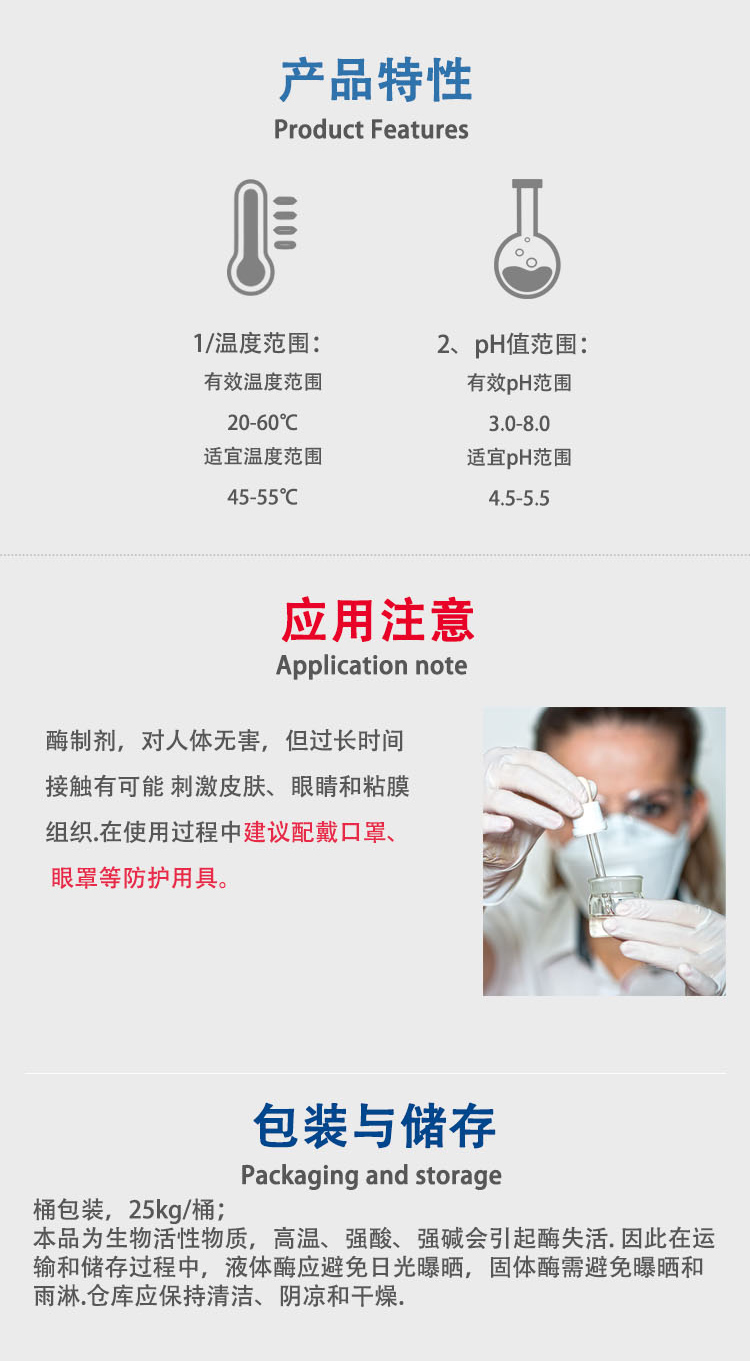该产品可以作为食品添加剂和配料,还可以作为食品、饮料、酒精发酵、污水处理等领域的生物催化剂。