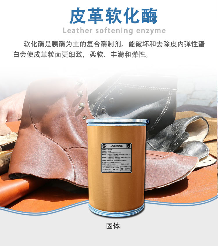 Softening enzyme is a compound enzyme mainly composed of trypsin. It is suitable for softening all kinds of leather. The softening effect is mild and uniform.