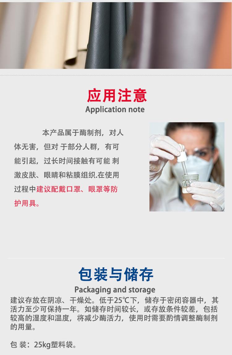 软化酶是以胰酶为主要的复合酶制剂。适合于各种类型革的软化,软化作用温和、均匀。
