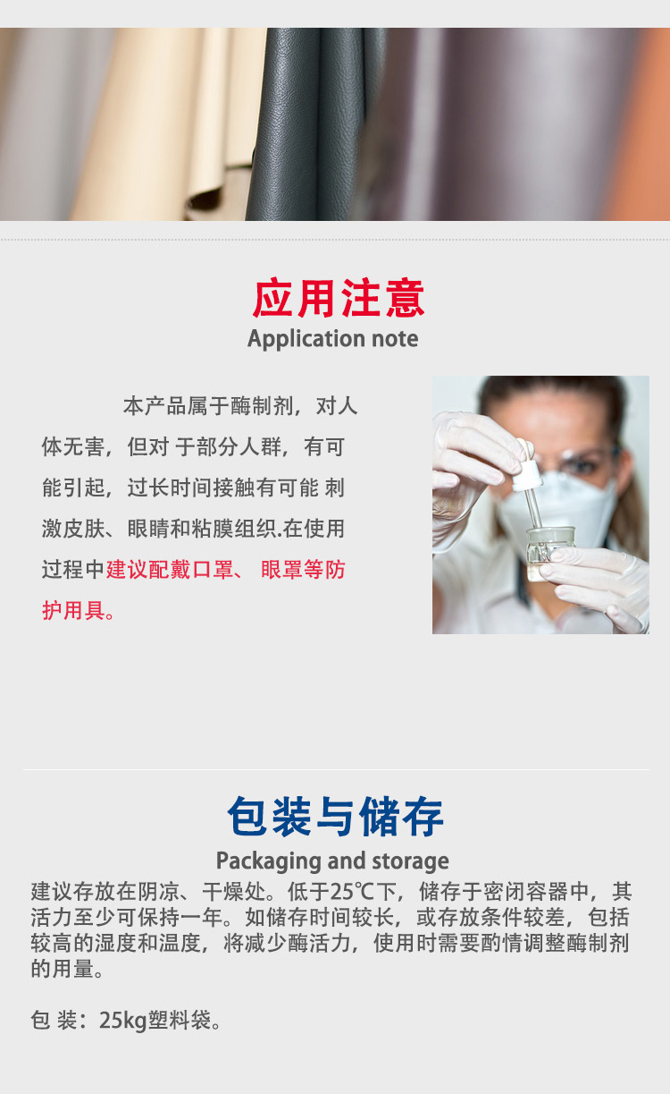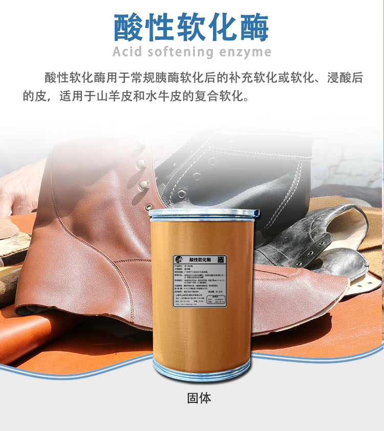 Acid-softening enzyme is used to supplement and soften the skin after conventional trypsin softening or after soaking in acid. It is suitable for compound softening of goat skin and buffalo skin.