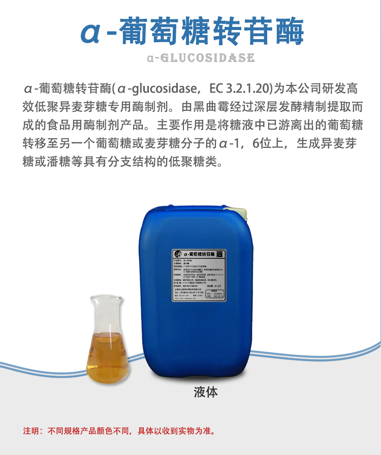 α-葡萄糖转苷酶(α-glucosidase,EC 3.2.1.20)为高效低聚异麦芽糖专用酶制剂。