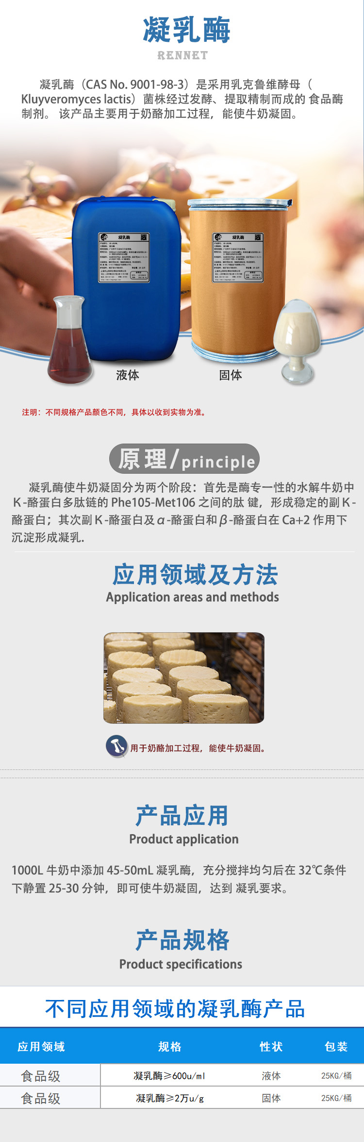 Rennin (Cas No. 9001-98-3) is a kind of food enzyme prepared by fermentation and extraction of Kluyveromyces lactis